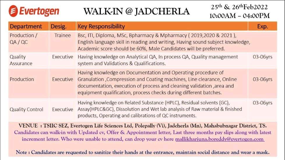 Greetings from EVERTOGEN LIFE SCIENCES LIMITED, We are conducting Walk-In Interviews on 25th & 26th Feb, 2022 at Jadcherla