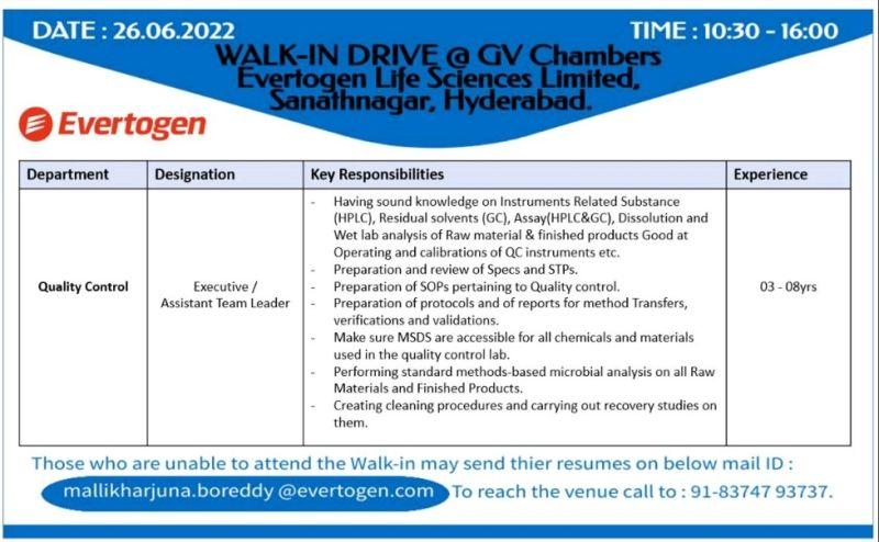 WALK-IN DRIVE @ GV Chambers Evertogen Life Sciences Limited, Sanathnagar, Hyderabad.