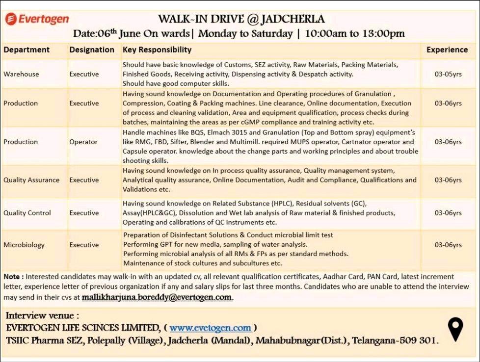 Note: Interested candidates may walk-in with an updated cv, all relevant qualification certificates, Aadhar Card, PAN Card, latest increment letter, experience letter of previous organization if any and salary slips for last three months. Candidates who are unable to attend the interview may send in their cvs at mallikharjuna.boreddy@evertogen.com