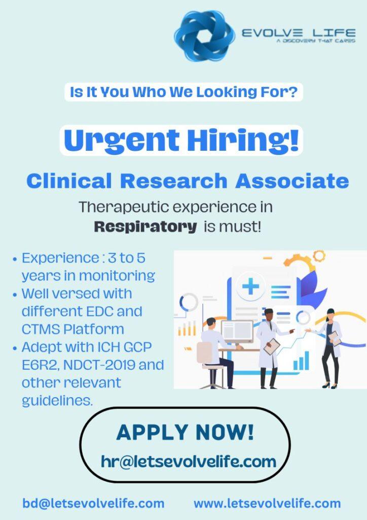 Evolve Life Research looking for dynamic individuals for the Position of “Clinical Research Associate.”