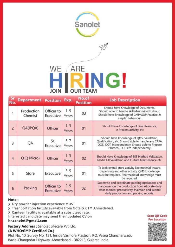 Sanolet Lifecare Pvt. Ltd., a WHO:GMP certified pharmaceutical company, is currently expanding its team and inviting talented professionals to join its facility in Ahmedabad. If you have experience in the pharmaceutical industry—specifically with dry powder injections—this could be the perfect next step for your career.