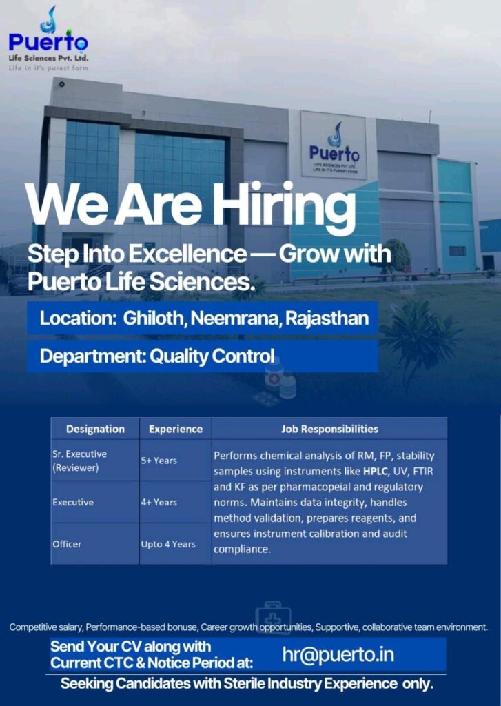 Puerto Life Sciences Pvt. Ltd. is officially opening its doors to talented professionals looking to elevate their careers in the pharmaceutical industry. Currently, the company is seeking dedicated experts to join their Quality Control (QC) Department at their facility in Ghiloth, Neemrana, Rajasthan.