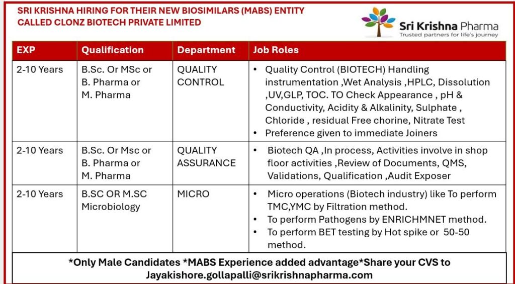 Sri Krishna Pharma is hiring for its new Biosimilars (MABS) entity, Clonz Biotech Private Limited. This recruitment drive focuses on specialized biotech operations and quality management.