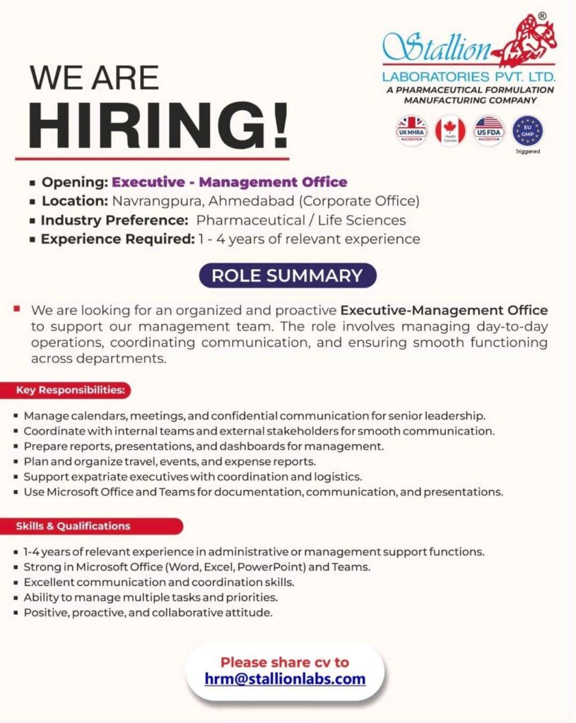 Stallion Laboratories Pvt. Ltd., a leading pharmaceutical formulation manufacturing company, is inviting applications for the position of Executive – Management Office at its corporate office in Navrangpura, Ahmedabad. This is an excellent opportunity for professionals seeking to build a rewarding career in the pharmaceutical or life sciences industry.