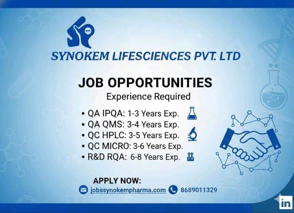Are you looking to elevate your career in the pharmaceutical industry? Synokem Lifesciences Pvt. Ltd. has announced several high-impact job opportunities for experienced professionals. As a growing player in the lifesciences sector, Synokem is looking for dedicated individuals to join their teams in Quality Assurance (QA), Quality Control (QC), and Research & Development (R&D).