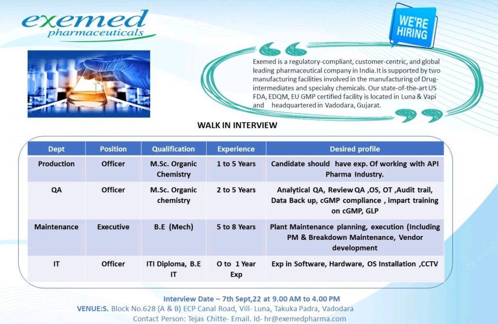 Exemed Pharma Walk In Interview for Production, QA, Maintenance & IT on 7th Sept,22