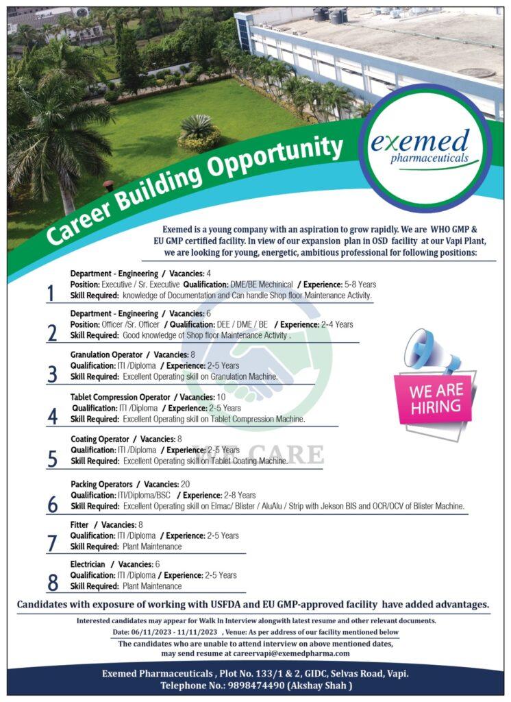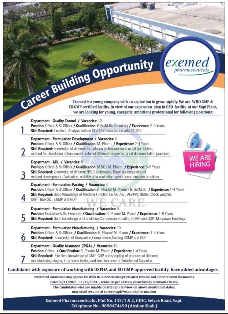 Exemed Pharmaceuticals multiple job vacancy for OSD facility at Vapi Plant | QA, QC, Mfg., Packing, FD & ADL department