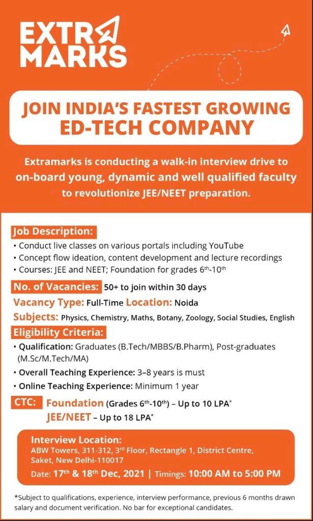 Extramarks ducting a walk in interview drive to on-board young, dynamic and well qualified faculty to revolutionize JEE/ NEET preparation.