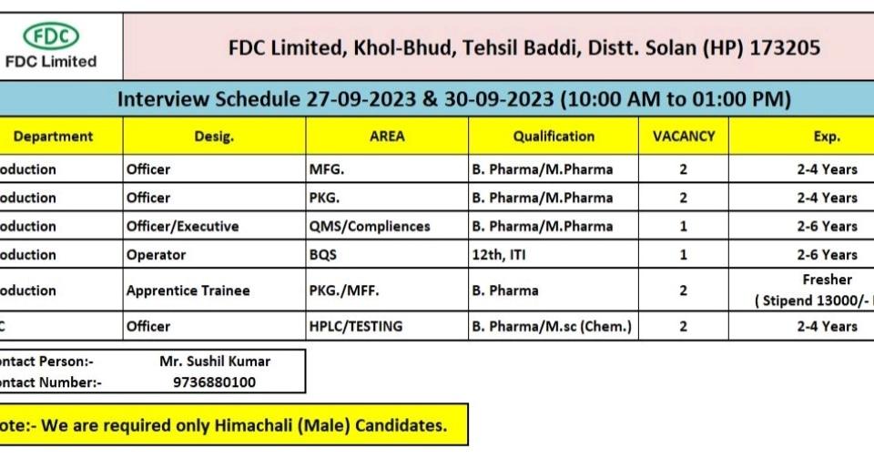 FDC Limited Walk In Drive on 27-09-2023 & 30-09-2023 for Quality Control & Production department
