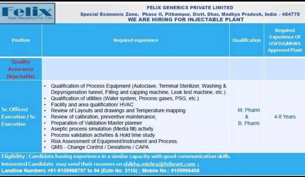 Felix Generics Pvt Ltd hiring for Quality Assurance department