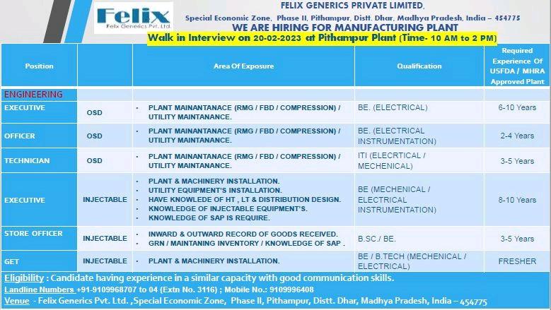 Felix Generics- Walk In Interview for QA, QC & Engineering on 20th & 21st February 2023