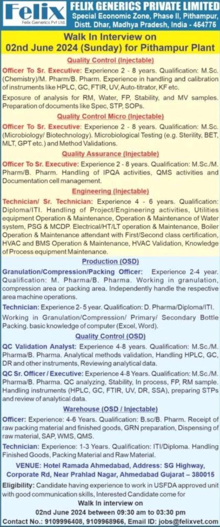Felix Generics Walk In Interview for QA, QC, Micro, Production, Engineering, Warehouse (OSD/Injectable) on 02nd June 2024 (Sunday)
