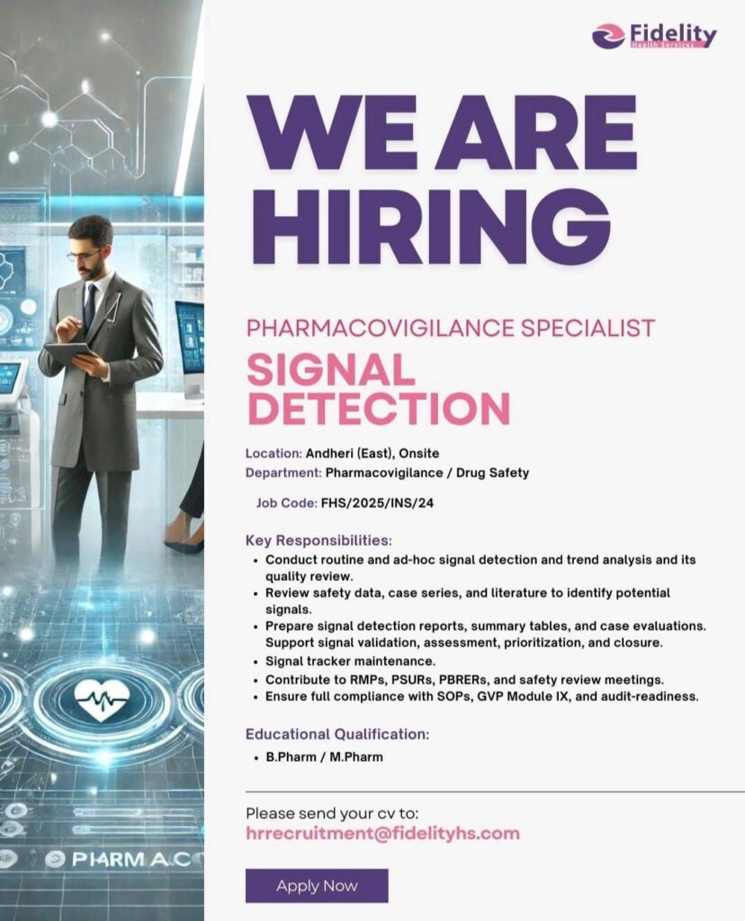 Are you an experienced professional in drug safety looking to advance your career in Signal Detection? Fidelity Health Services is currently expanding its Pharmacovigilance team and is seeking a dedicated Pharmacovigilance Specialist to join their office in Andheri (East), Mumbai.