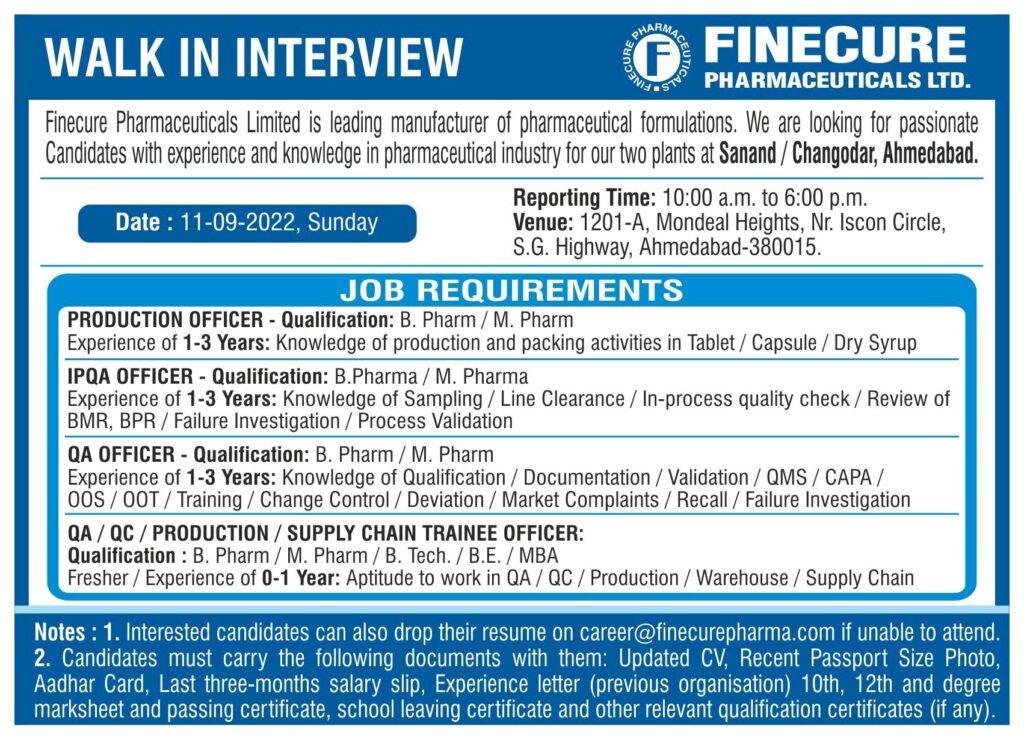 Finecure Pharmaceuticals Ltd. Walk in interview for Production/ QA/ QC /Supply chain on 11th September 2022