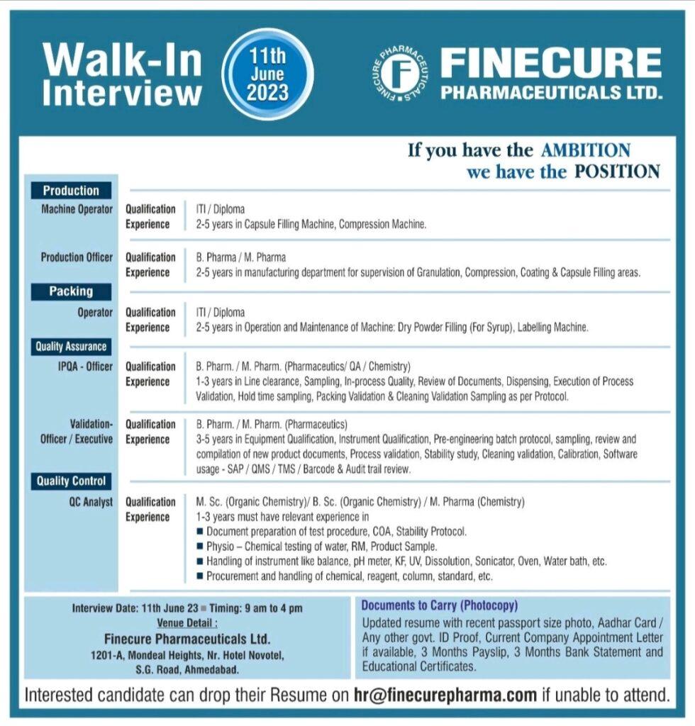 Finecure Pharmaceuticals – Walk-In Interview for Production, Packing, QA & QC on 11th June 23