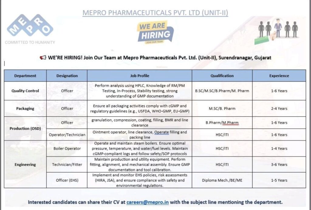 Are you a skilled professional looking to advance your career in the dynamic pharmaceutical industry? Mepro Pharmaceuticals Pvt. Ltd. (Unit-II) has opened its doors for talented and dedicated individuals to join their growing team in Surendranagar, Gujarat. This is a prime opportunity to become part of a company dedicated to quality and humanity through the manufacture of essential medicines.