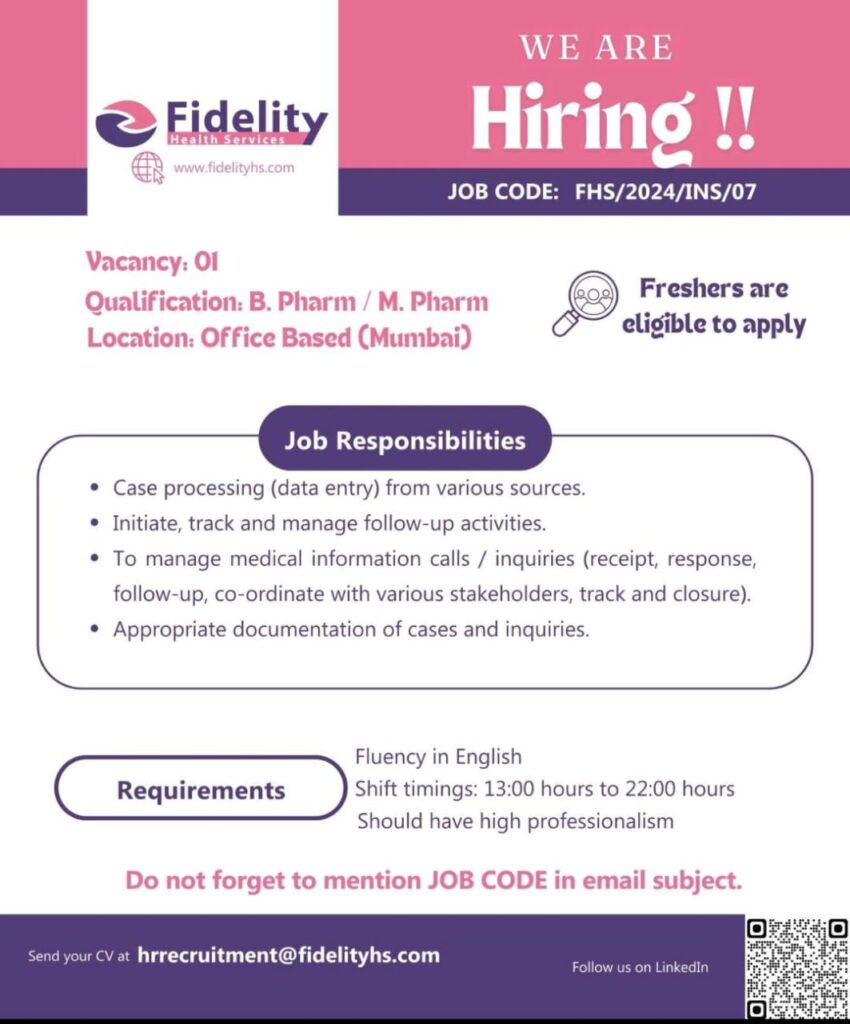 Fidelity Health Services looking for a talented Drug Safety Executive – freshers