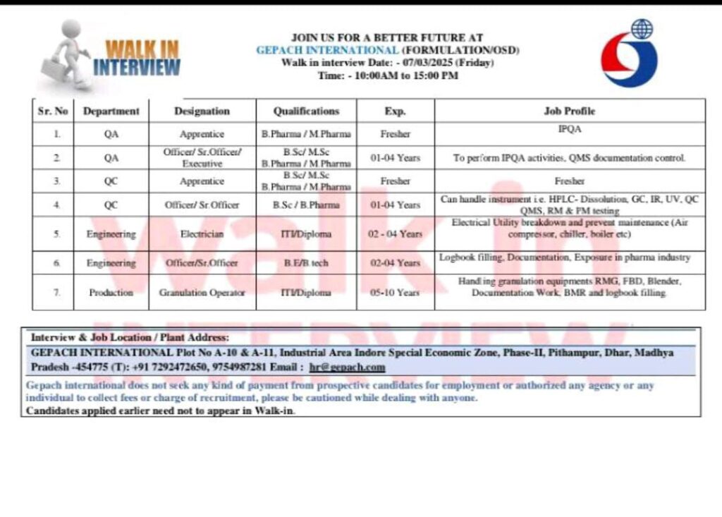 Qualification:B.Sc/ M.Sc/ B. Pharma / M Pharma