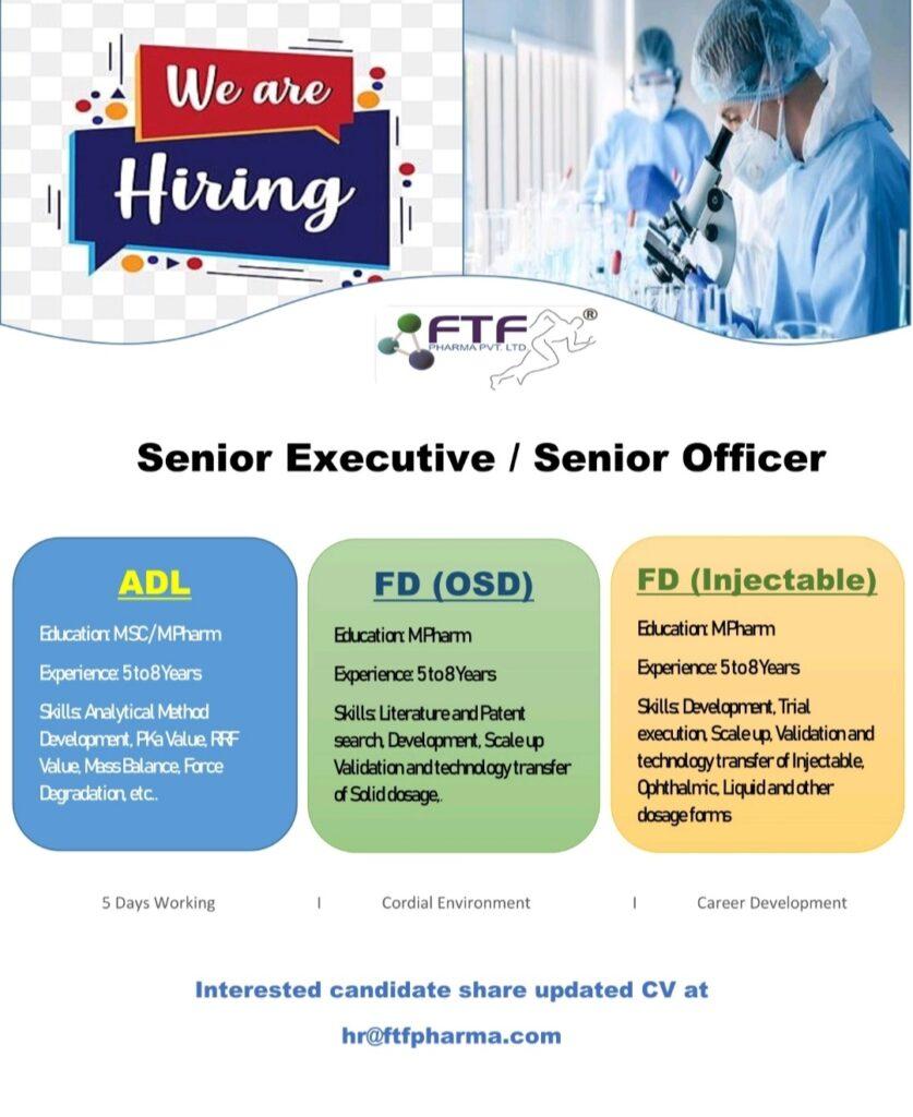 FTF Pharma- Hiring Senior Executive / Senior Officer- ADL, FD (OSD) & FD (Injectable) Apply Now