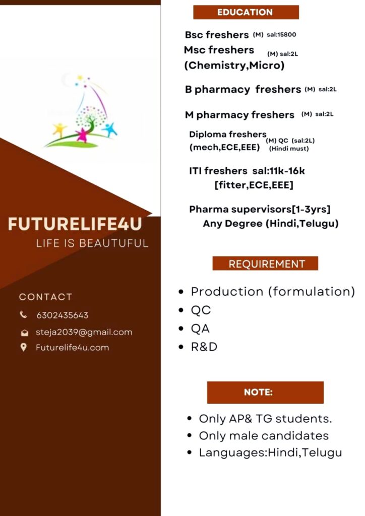 Futurelife4u hiring B.Sc, M.Sc, B.Pharmacy, M.Pharmacy, ITI, Diploma Freshers & experience for Production / QC / QA / R&D / Pharma Supervisors