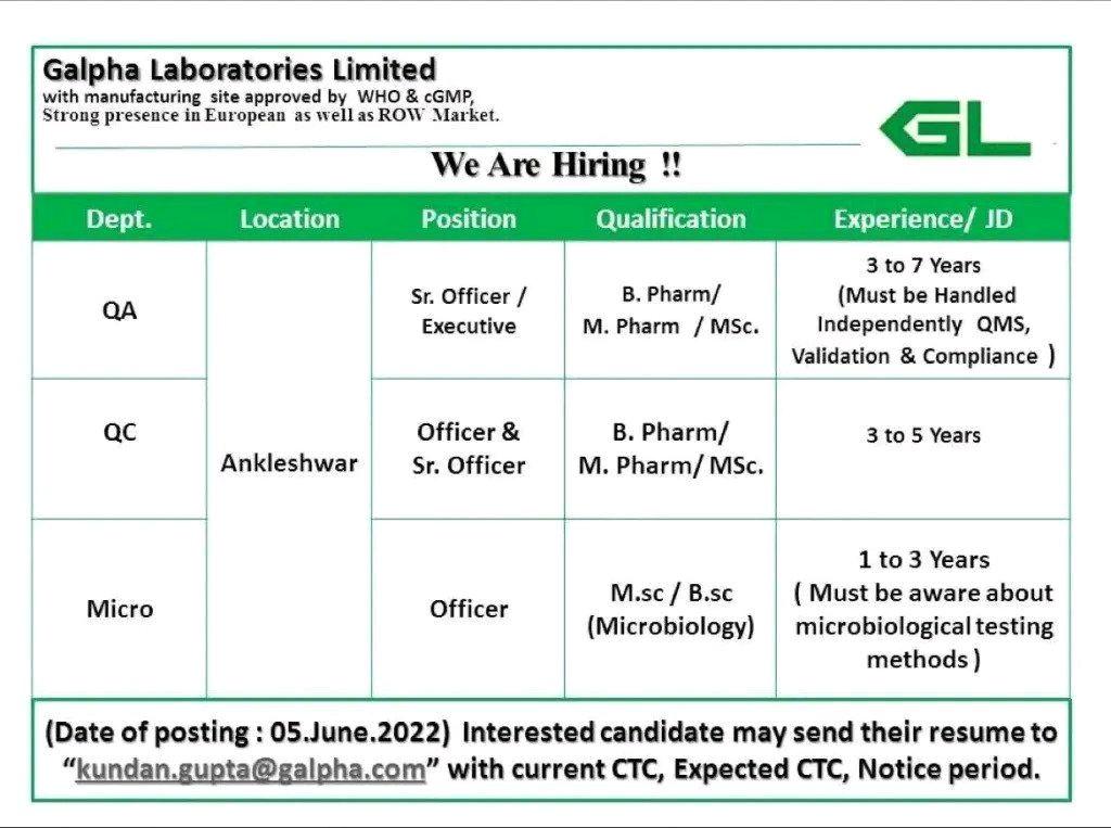 Galpha Laboratories Ltd Hiring for QA, QC, Micro department