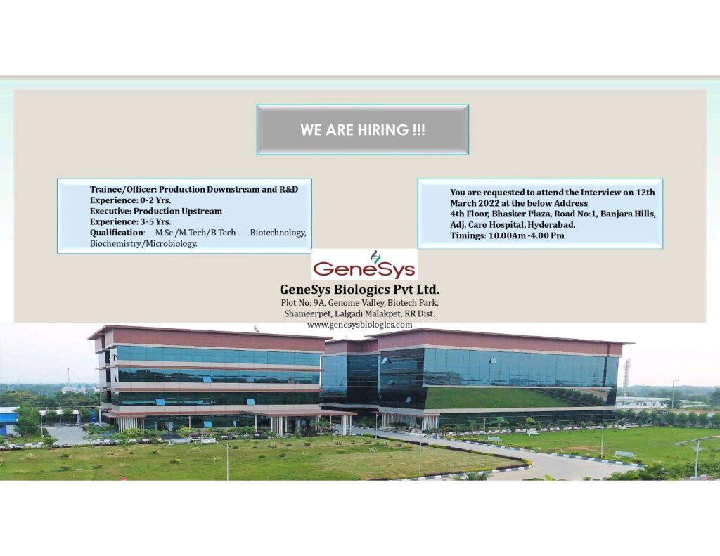 GeneSys Biologics : Hiring M.Sc/ M.Tech/ B.Tech Fresher & experience for Trainee & Officer- Production department || Walk-in on 12th March 2022