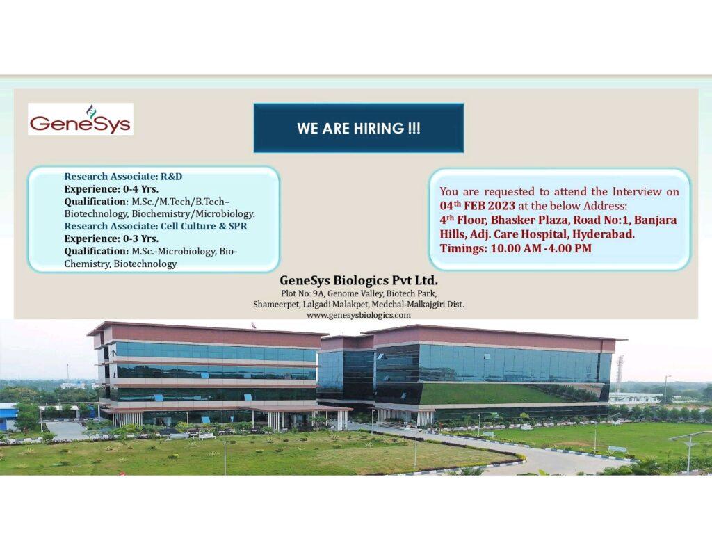 GeneSys Biologics Pvt Ltd. WALK In Interview for Freshers & Experience- M.Sc./ M.Tech/ B.Tech-Biotechnology, Biochemistry/Microbiology in R&D, Cell Culture & SPR on 04th FEB 2023