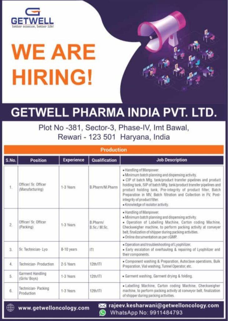 GETWELL PHARMA- Hiring for multiple opening in Production & Packing department