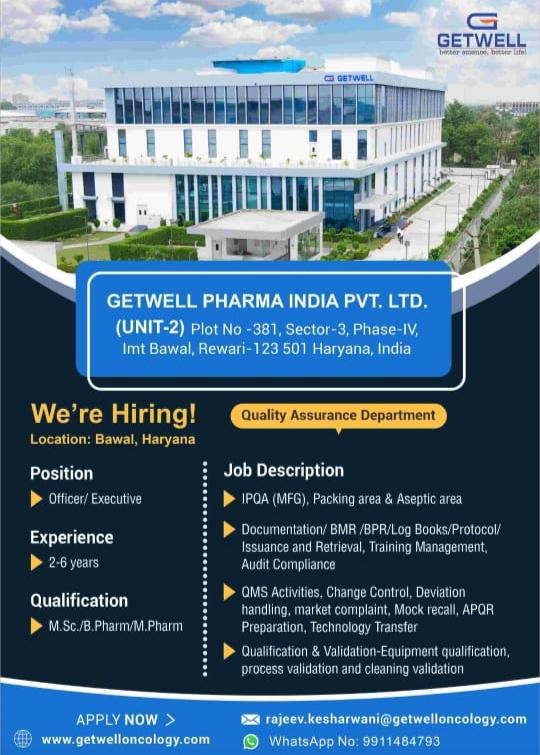 GETWELL PHARMA job vacancy for Officer/ Executive – Quality Assurance Department
