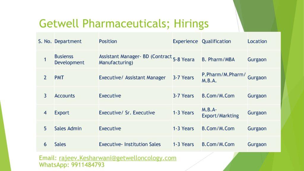 Getwell Pharmaceuticals; Hirings for Busienss Development, PMT, Accounts, Export, Sales Admin, Sales department