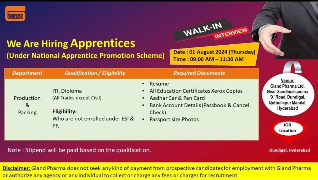 Gland Pharma Hiring Apprentices- walk in interview on 01 August 2024 (Thursday)
