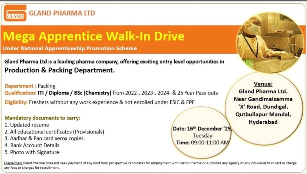 Gland Pharma Ltd, a leading name in the pharmaceutical industry, has announced a Mega Apprentice Walk-In Drive under the National Apprenticeship Promotion Scheme (NAPS). This drive offers excellent entry-level opportunities for freshers ready to begin their careers in the Production and Packing Department.