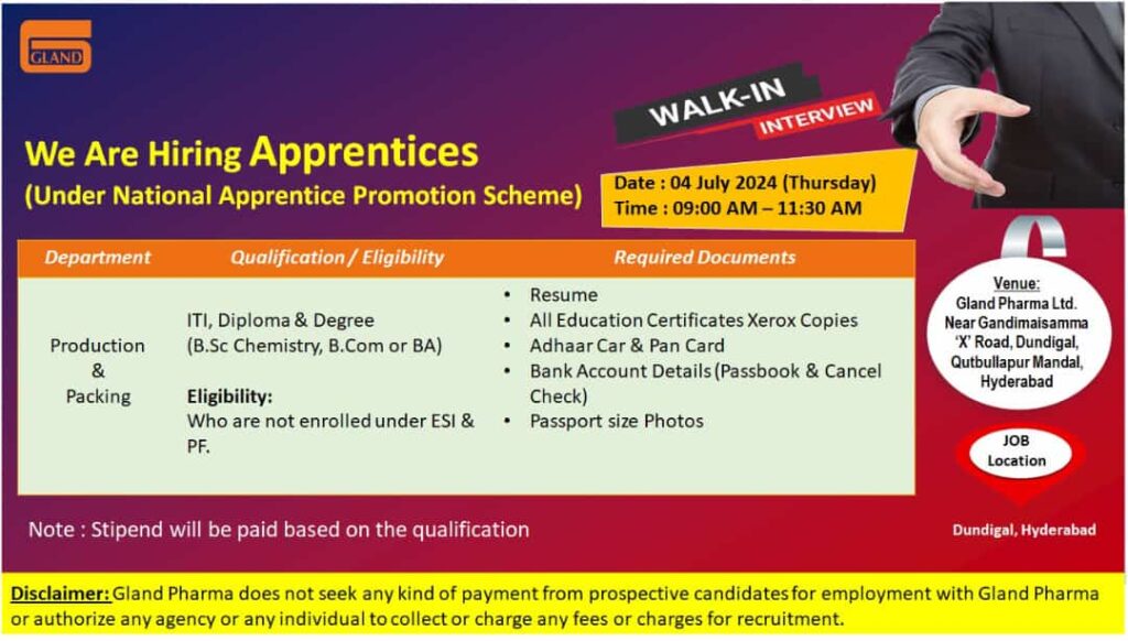 Gland Pharma Ltd. Hiring Apprentices for Production & Packing || Freshers walk in interview on 04 July 2024 (Thursday)