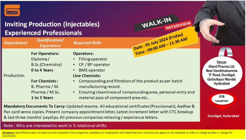 Gland Pharma Ltd walk in interview for Operators/ Chemists in Production (Injectables) Experienced on 05 July 2024 (Friday)