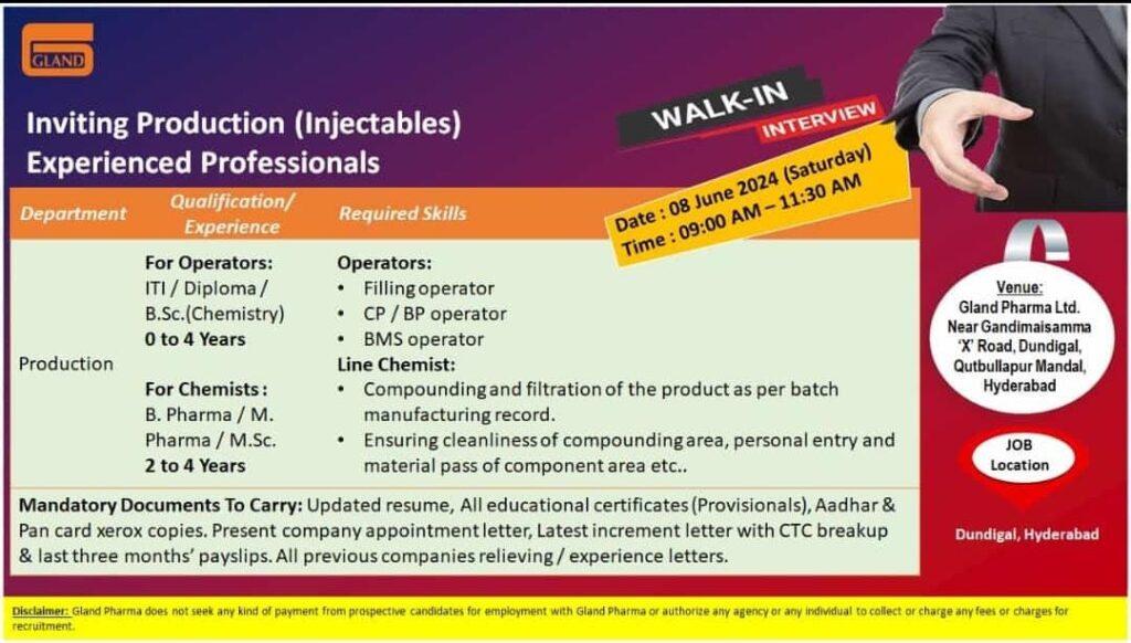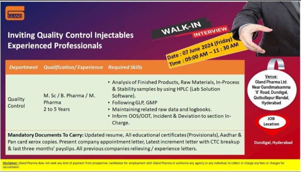 Gland Pharma Ltd. walk in interview for Quality Control & Production on 7th & 08th June 2024 (Saturday)