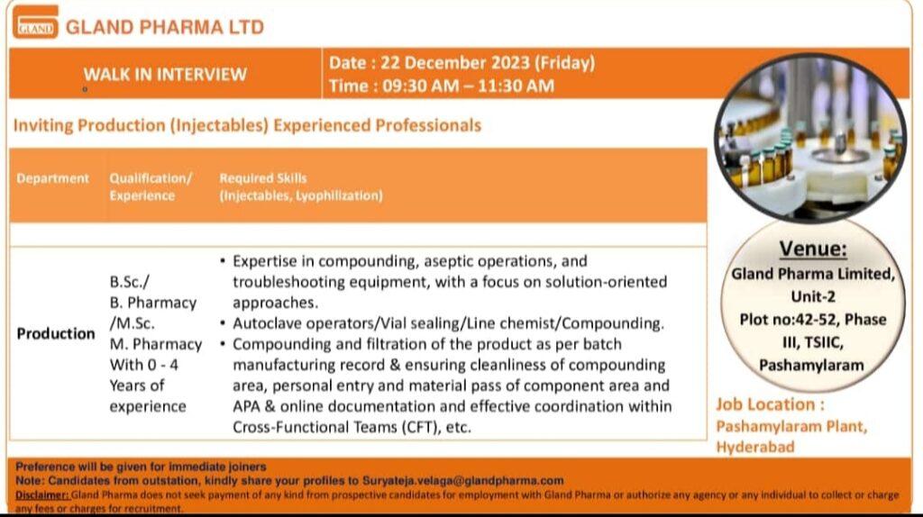 Gland Pharma walk in interview for freshers & experience- Production (Injectables) on 22nd December 2023