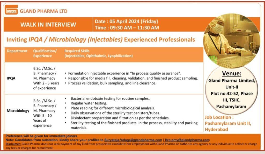 Gland Pharma walk in interview for IPQA & Microbiology on 05th April 2024 (Friday)