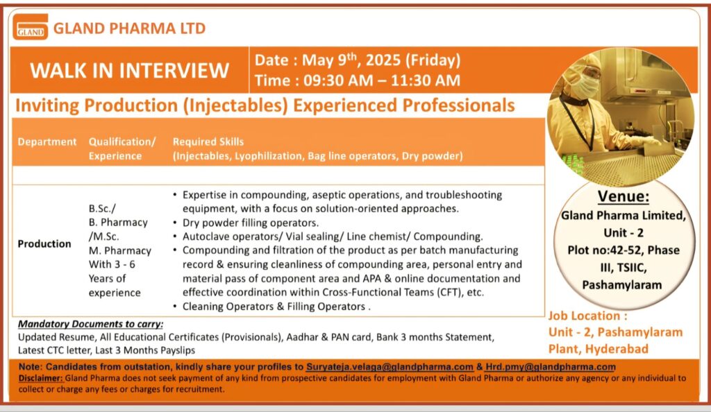 Note: Candidates from outstation, kindly share your profiles to Suryateja.velaga@glandpharma.com & Hrd.pmy@glandpharma.com