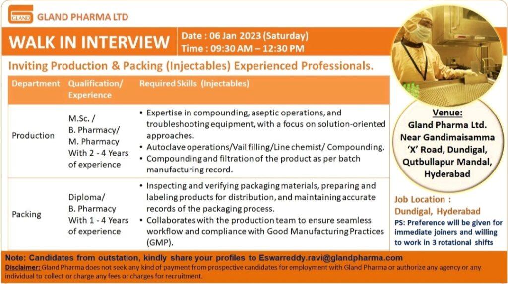 Gland Pharma walk in interview for Production & Packing (Injectables) on 06th Jan 2024 (Saturday)