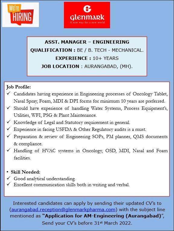 Interested candidates an apply by sending their updated CV’s to aurangabad.reception@glenmarkpharma.com with the Subject line mentioned as “Application for AM- Engineering (Aurangabad)”, Send your CV before 31st March 2022.