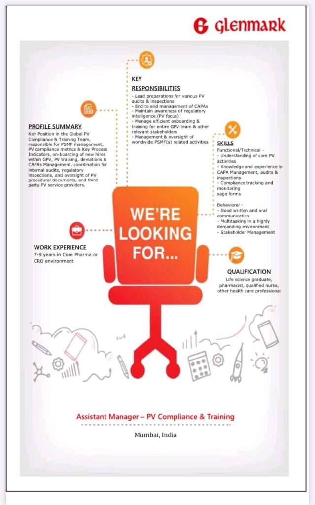 Glenmark hiring for Assistant Manager – PV Compliance & Training