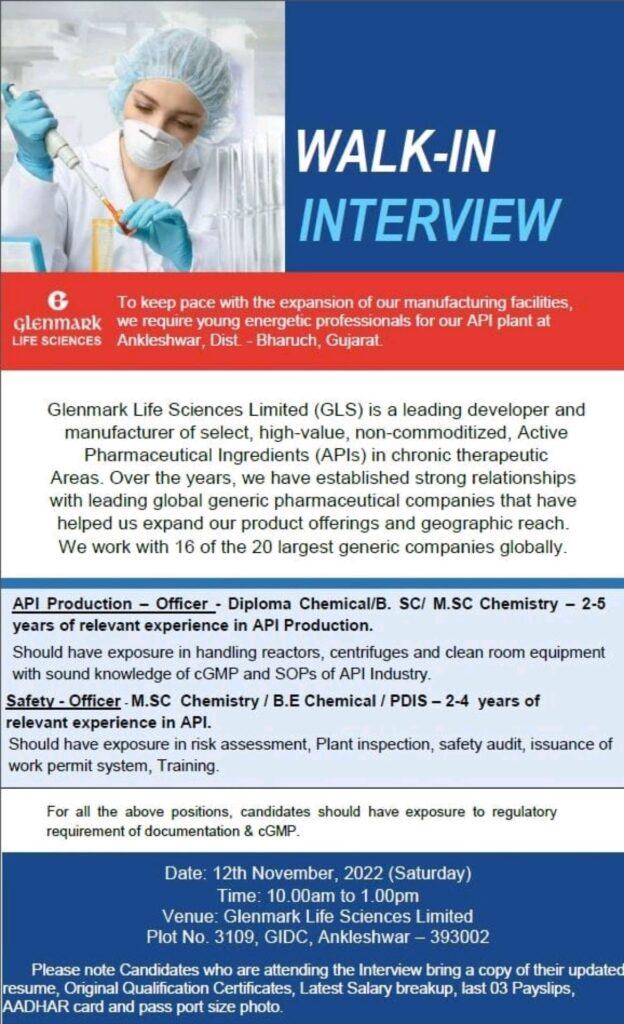 Glenmark Life Sciences Limited Walk In Interview for API Production Officer, Safety Officer on 12th November, 2022