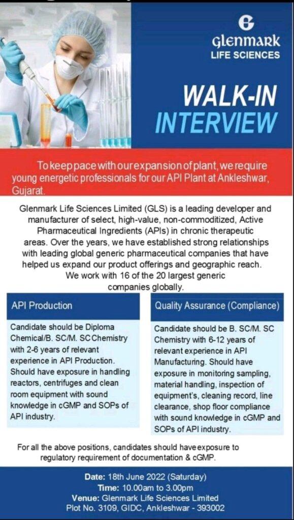 Glenmark Life Sciences Walk In Interview for API Production & Quality Assurance (Compliance) on 18th June 2022