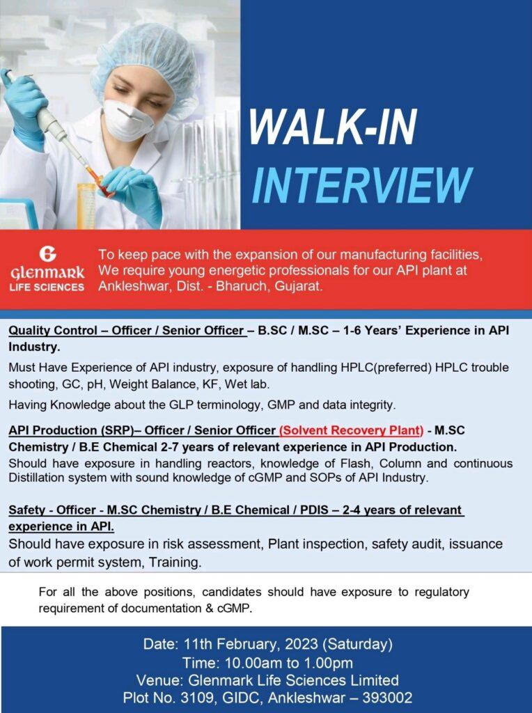 Glenmark Life Sciences- Walk In Interview for Officer / Senior Officer- QC, API Production (SRP), Safety on 11th February, 2023