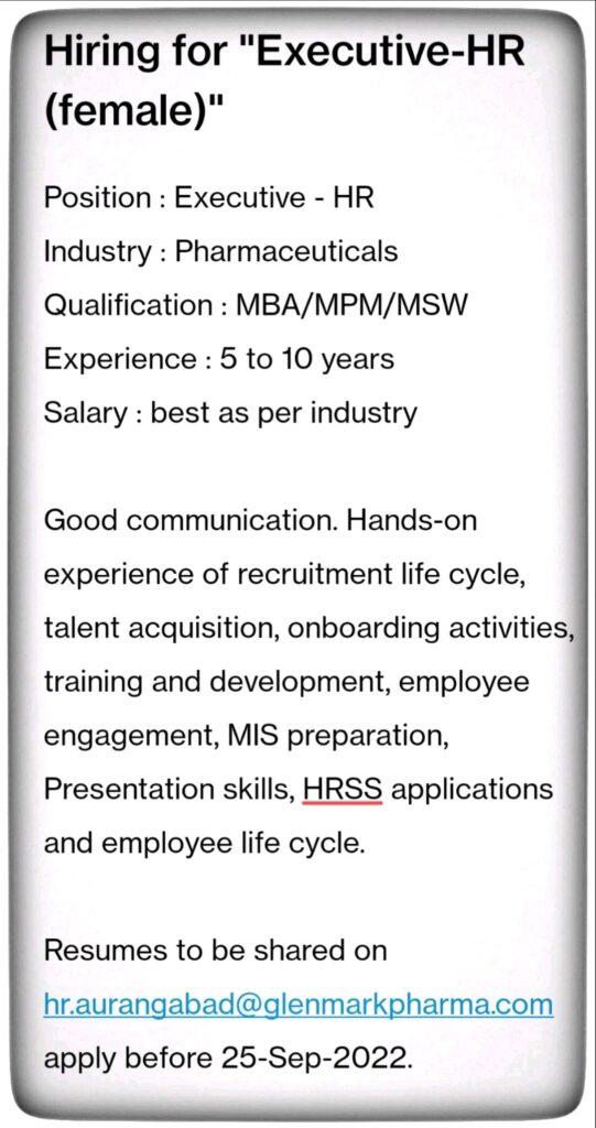 Glenmark Pharma Hiring “Executive-HR (female)” for Generalist role at our Aurangabad site
