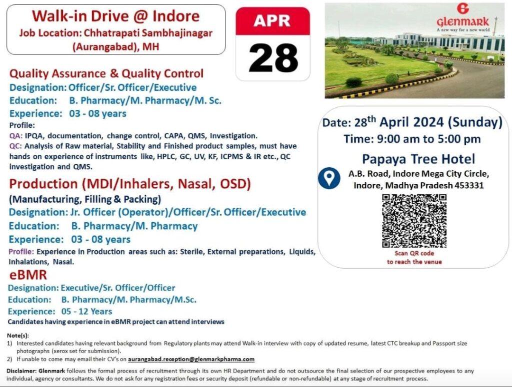 Glenmark Pharma Walk-in Drive @ Indore on 28th April 2024 | QA, QC, Production, eBMR