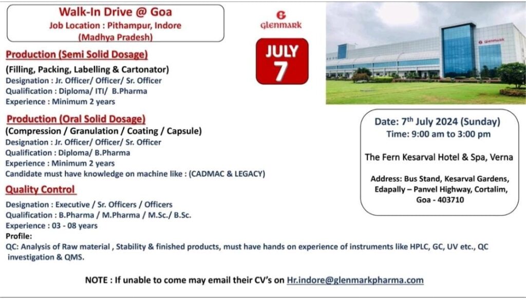 Glenmark Pharmaceutical Ltd., Indore conducting Walk in Drive in Goa on 7th July 2024 (Sunday)