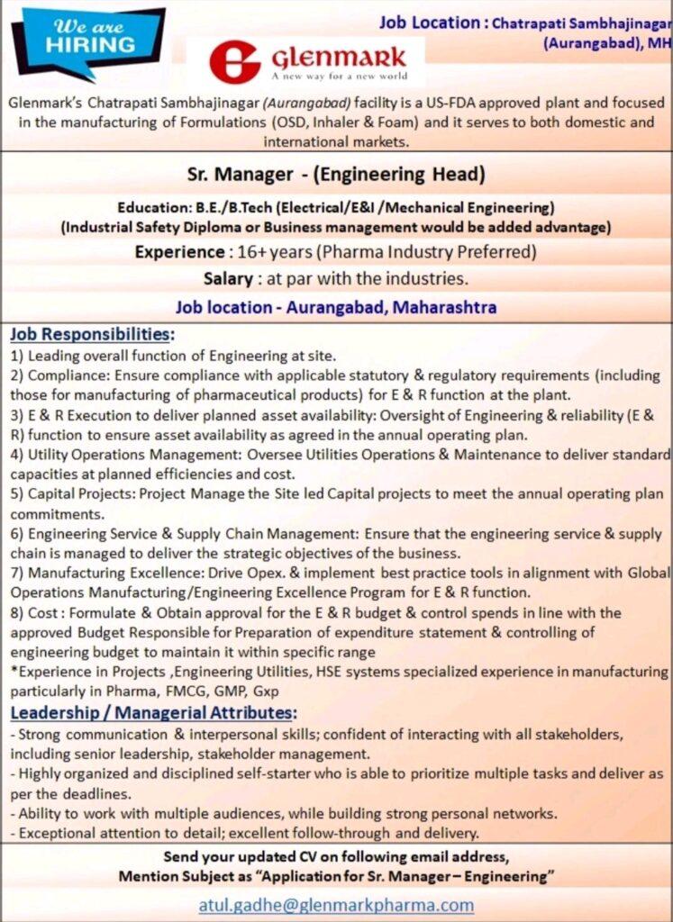 We at Glenmark Pharmaceuticals Limited are hiring for Senior Manager – Engineering for Chatrapati Sambhajinagar Location.