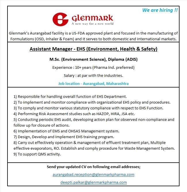 Glenmark Pharmaceuticals urgent vacancy for “Asst. Manager – EHS” at Aurangabad location