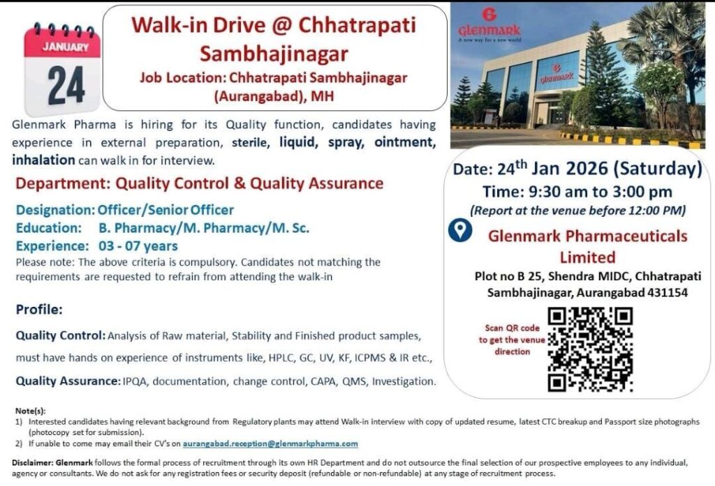 Glenmark Pharmaceuticals Limited, a leading global pharmaceutical company, is conducting a Walk-in Drive for experienced professionals in Quality Control (QC) and Quality Assurance (QA). Candidates with relevant exposure to sterile, liquid, spray, ointment, and inhalation formulations are encouraged to attend.